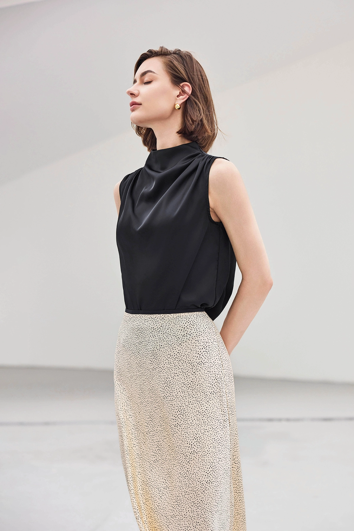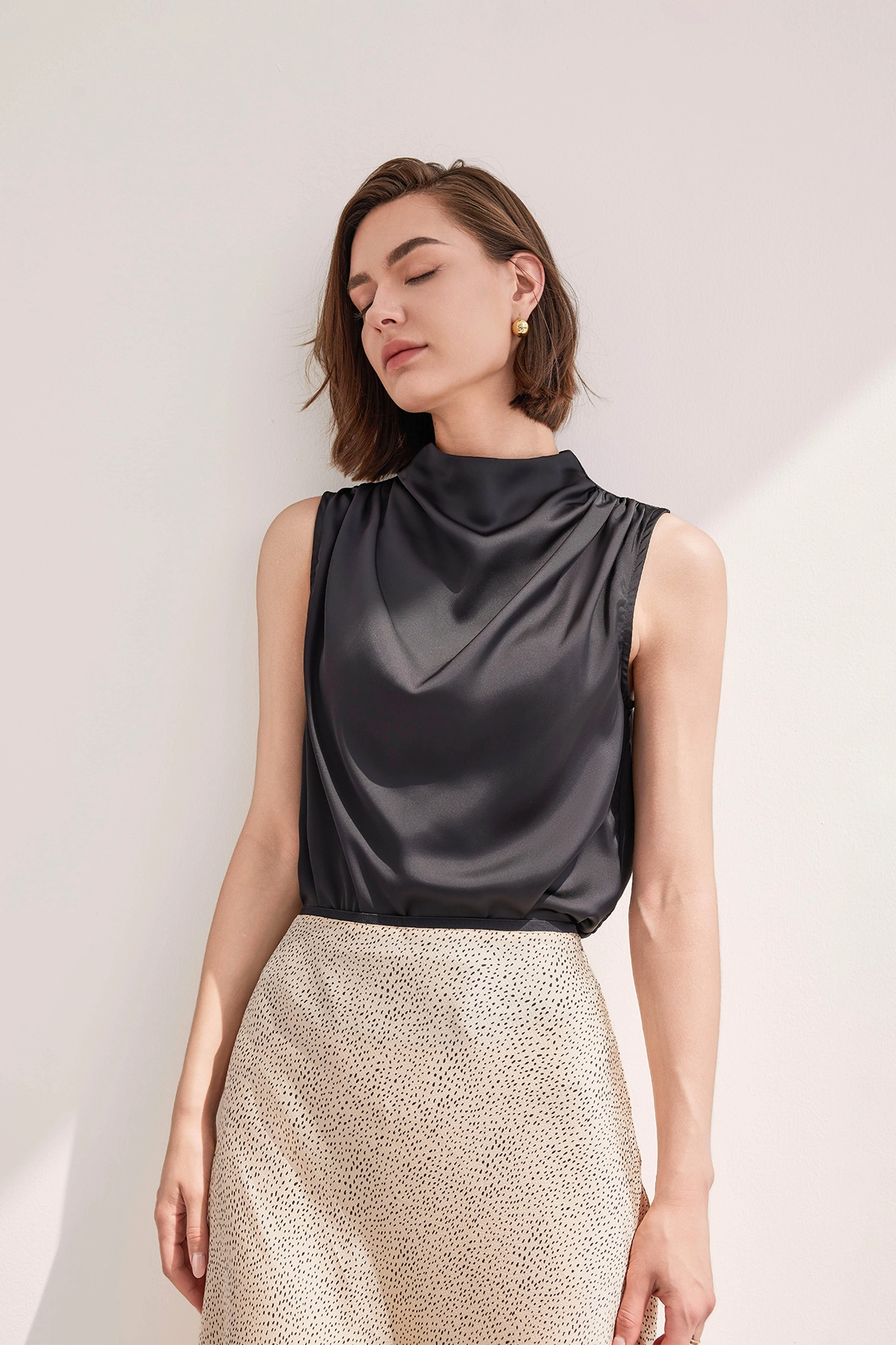 Elevate your look with this CicyBell Black Mock Neck Satin Tank Top. Featuring a silky texture and chic ruched detailing, this sleeveless blouse offers sophisticated style. Perfect for dressing up jeans or layering under blazers for a polished ensemble, it brings a touch of luxury to any outfit.