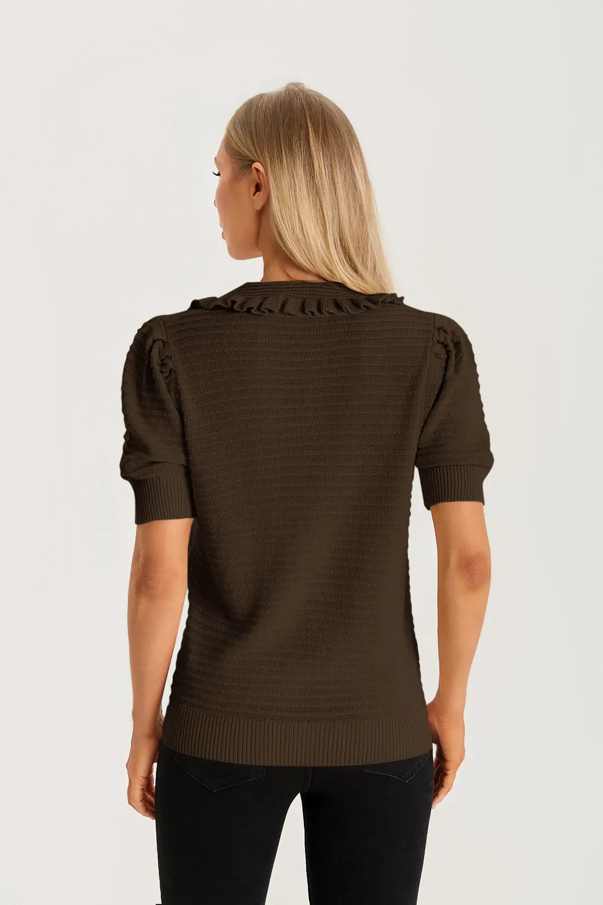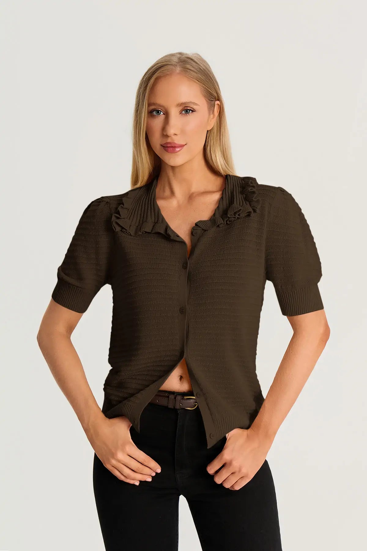 Cicy Bell Coffee Ruffle Peter Pan Collar Cardigan Sweater embrace timeless femininity. Crafted from soft, breathable ribbed knit, this short-sleeve top features a delicate button-up design and elegant eyelet detailing. Perfect for layering over dresses or wearing as a standalone top. Style it with high-waisted jeans or skirts for brunch dates, office wear, or casual outings. A versatile piece that seamlessly blends vintage charm with modern comfort for year-round elegance.