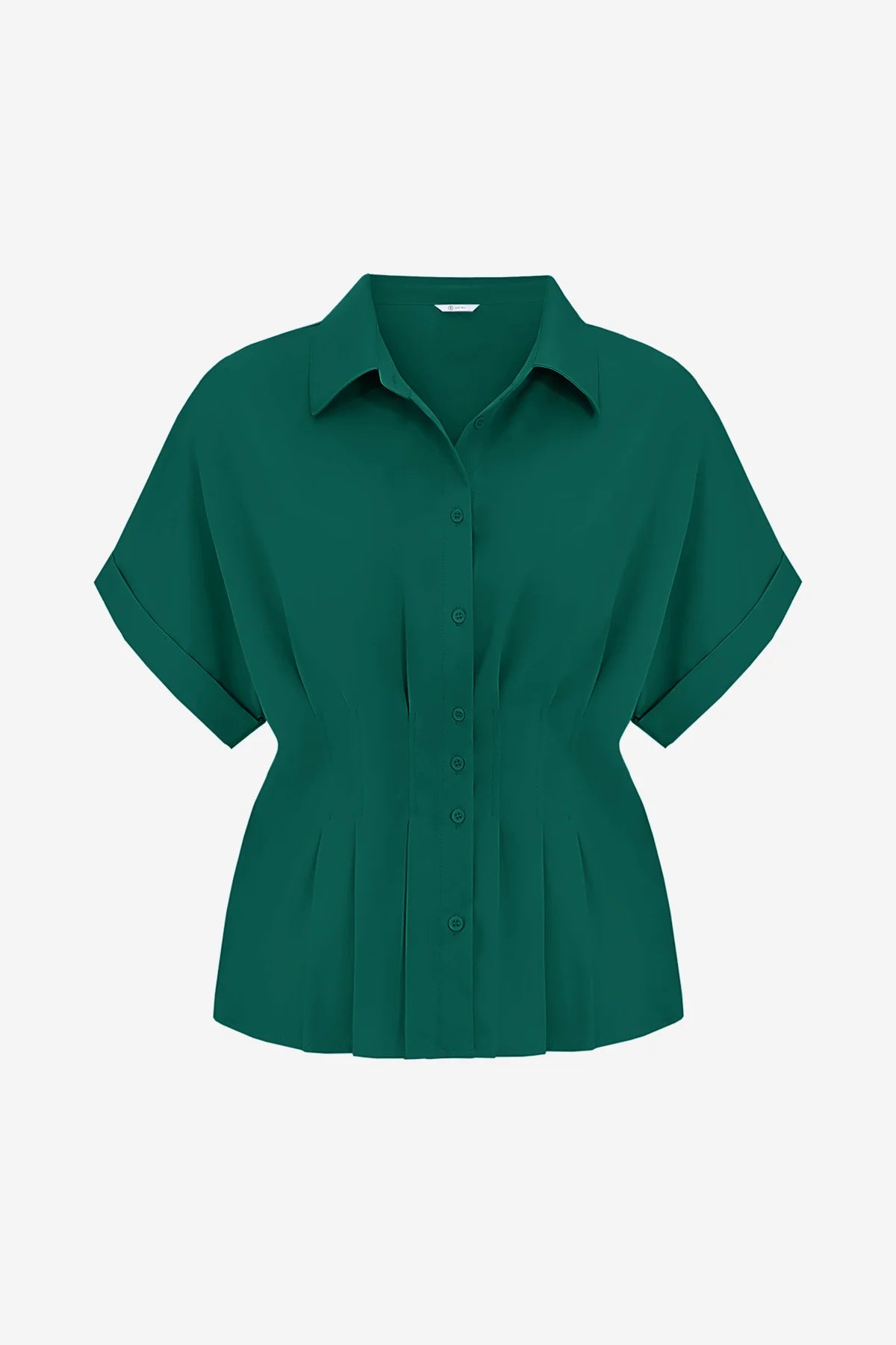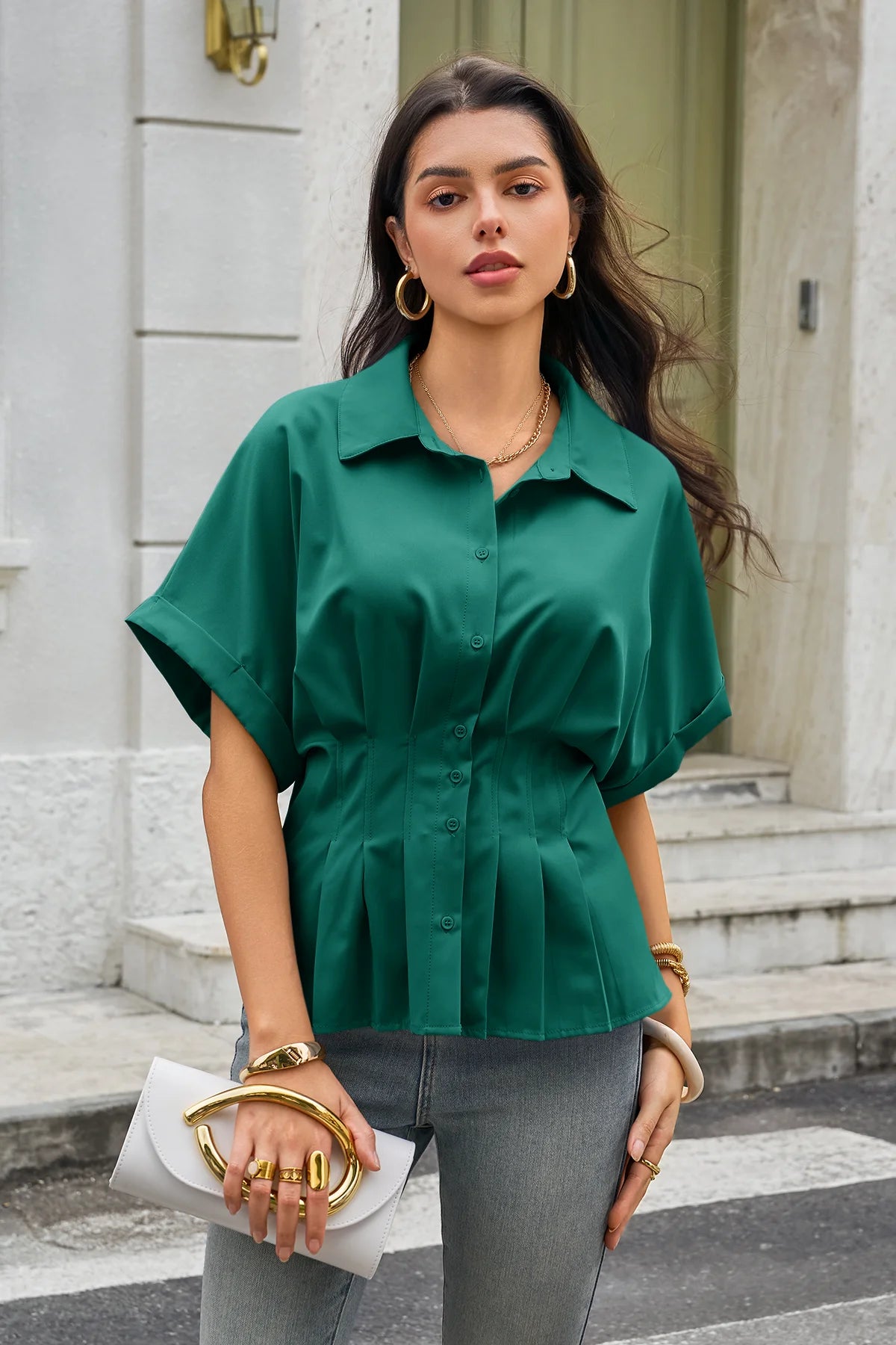 Cicy Bell Womens Deep Green Pleated Button-Down Shirt discover effortless style. This short-sleeve peplum top features a flattering fitted waist, chic batwing cuffs, and elegant pleating for a polished look. Crafted from lightweight, stretchy fabric (95% polyester, 5% elastane), it combines comfort and sophistication. Perfect for pairing with jeans or skirts, this versatile blouse transitions seamlessly from summer casual to dressy office wear.