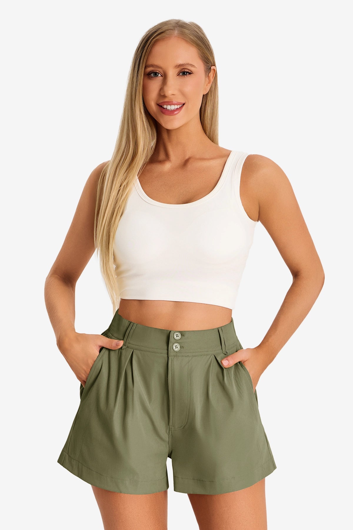Description: Elevate your warm-weather wardrobe with these Womens Army Green High Waisted Shorts by CicyBell. Featuring a flattering pleated design and a comfortable wide-leg cut, these breathable shorts are perfect for summer vacations or casual daily wear. The secure double-button closure and four functional pockets blend chic style with everyday utility.