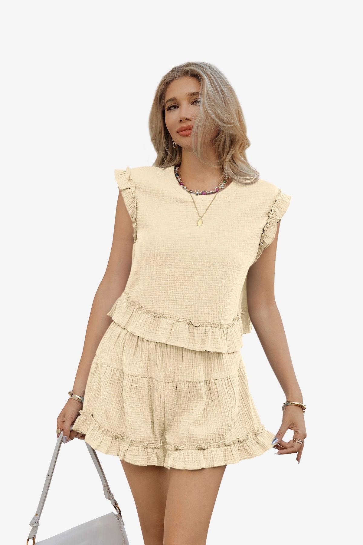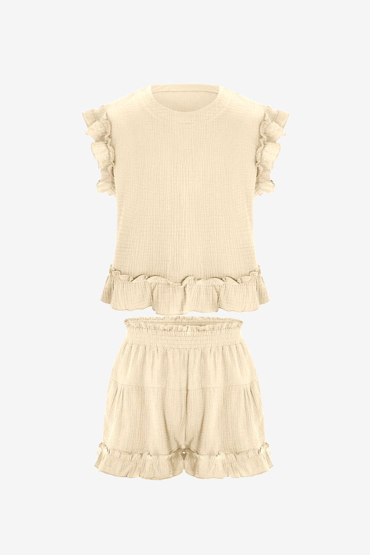This women’s 2-piece lounge set features a 100% cotton fabric for softness, breathability, and all-day comfort. The top has a ruffled short sleeve design with a crew neck and back buttons, while the elastic high-waist shorts include a ruffle hem. Its loose fit and solid color offer a flattering, casual style.