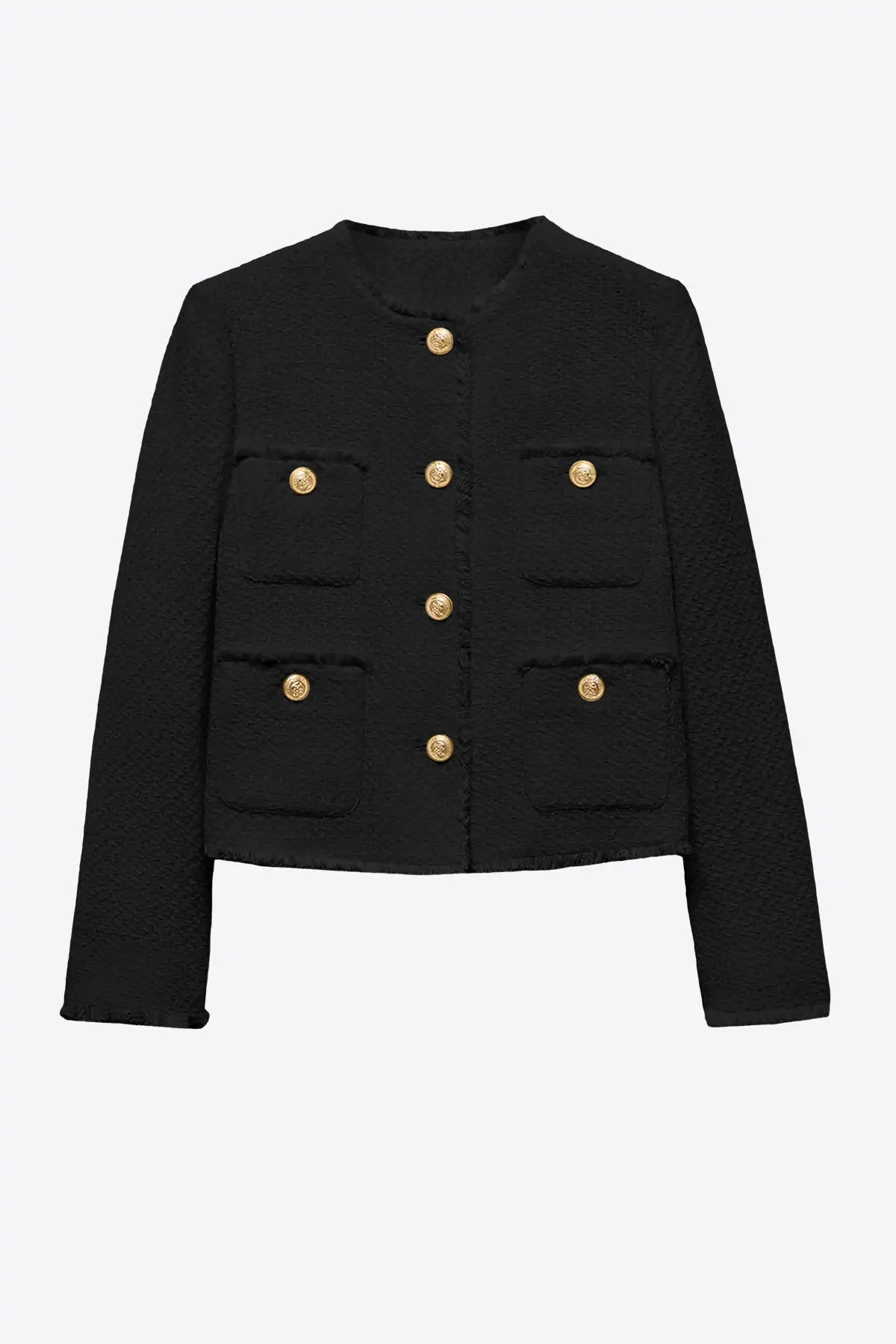 Cicy Bell 2025 Women's Collarless Tweed Cropped Blazer it’s soft, structured, and shape-retaining. Features rounded neck, long sleeves, front metallic buttons, four patch pockets, frayed finish, and inner lining. Short cropped straight design flatters your figure, easy to pair with tees, dresses, jeans or skirts – perfect for casual daily wear or office looks.