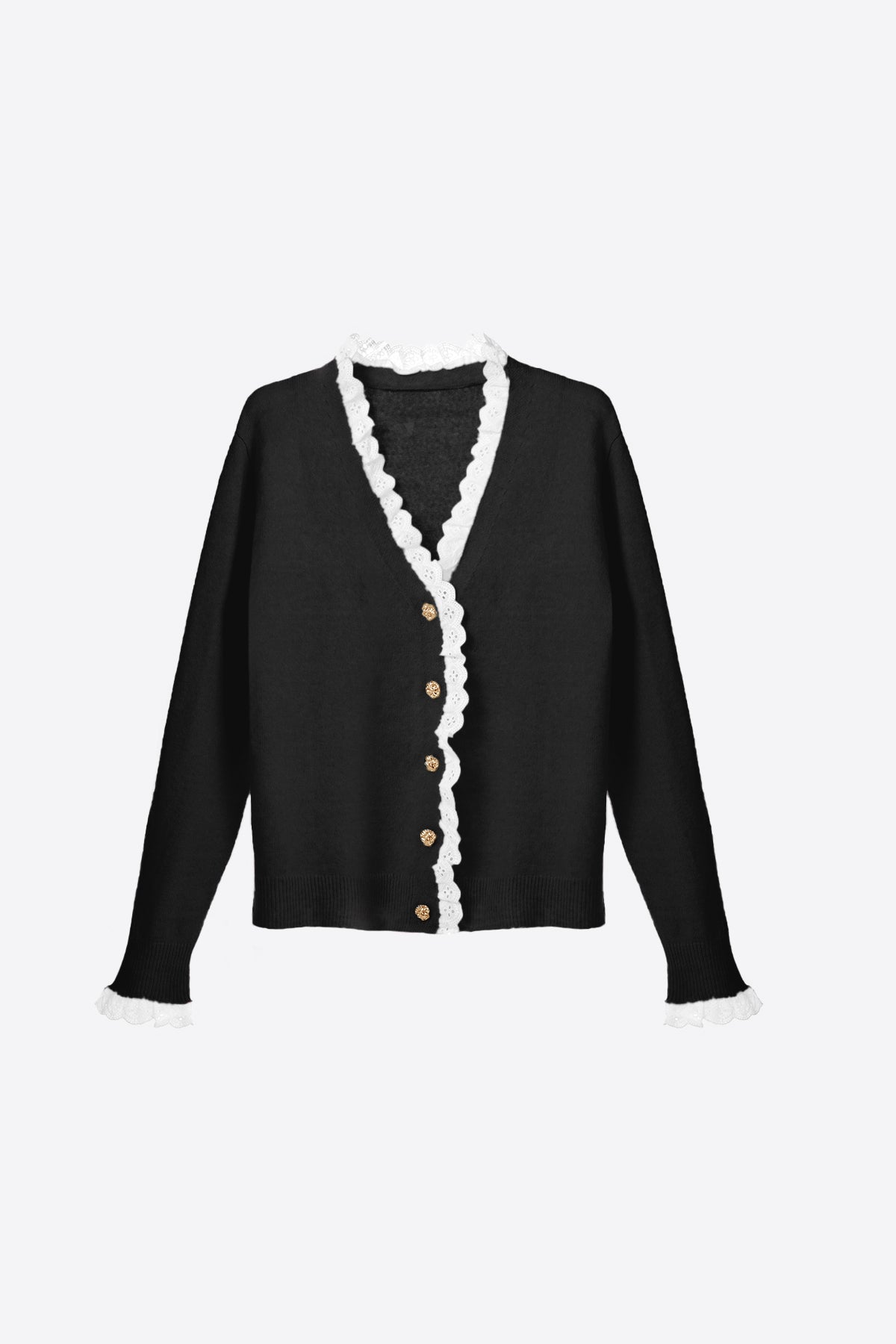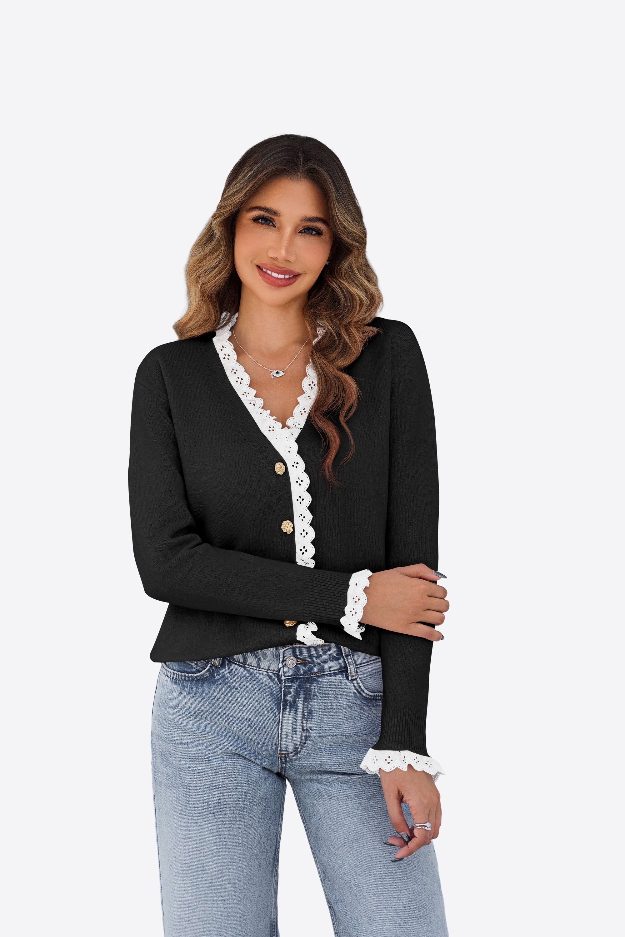 Cicy Bell Women’s Lace V-Neck Cardigan features lightweight knit fabric for softness, stretch, and comfort. Its elegant lace trims on sleeves and neckline, combined with a flattering V-neck design, enhance style. The open front with button-up closure ensures easy wear, while the loose fit offers versatility.