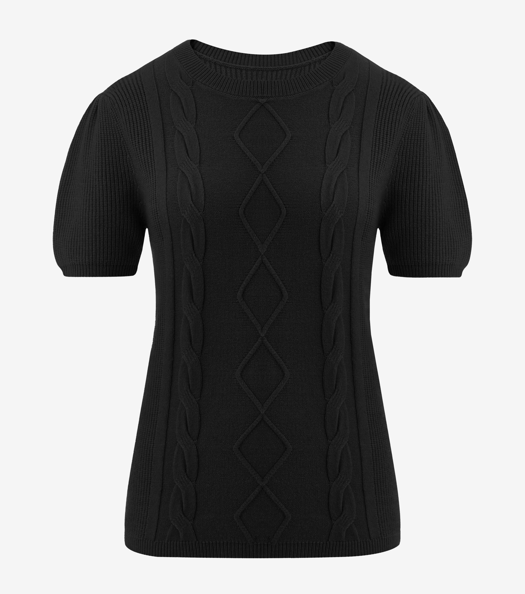 Upgrade your transitional wardrobe with this Womens Black Puff Short Sleeve Sweater by CicyBell. Featuring a classic cable knit texture and trendy puff sleeves, this lightweight crewneck top offers a flattering slim fit. Perfect for layering under blazers for work or styling solo for a chic spring look.