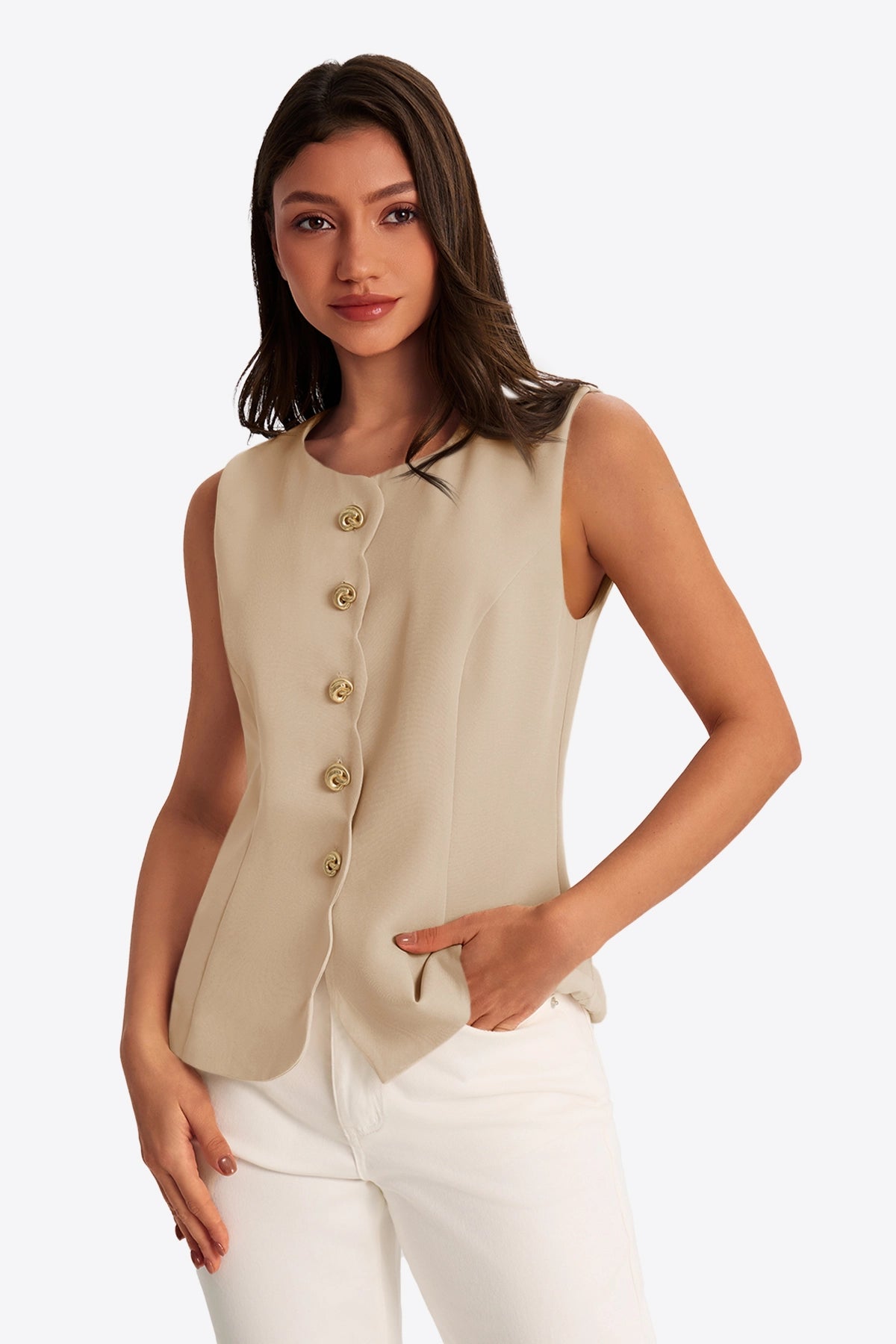 Fitted round neck and button-down closure for a polished, structured silhouette that flatters the figure.
