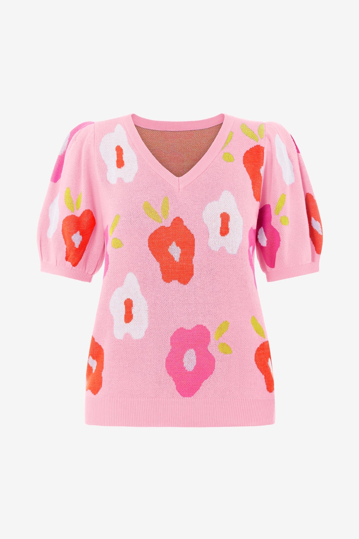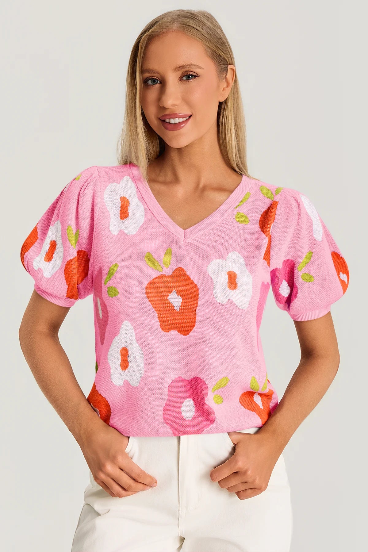 Womens Pink Floral Puff Short Sleeve Sweater | CicyBell