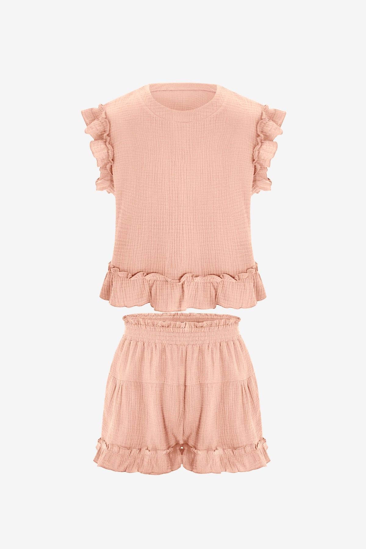 This women’s 2-piece lounge set features a 100% cotton fabric for softness, breathability, and all-day comfort. The top has a ruffled short sleeve design with a crew neck and back buttons, while the elastic high-waist shorts include a ruffle hem. Its loose fit and solid color offer a flattering, casual style.