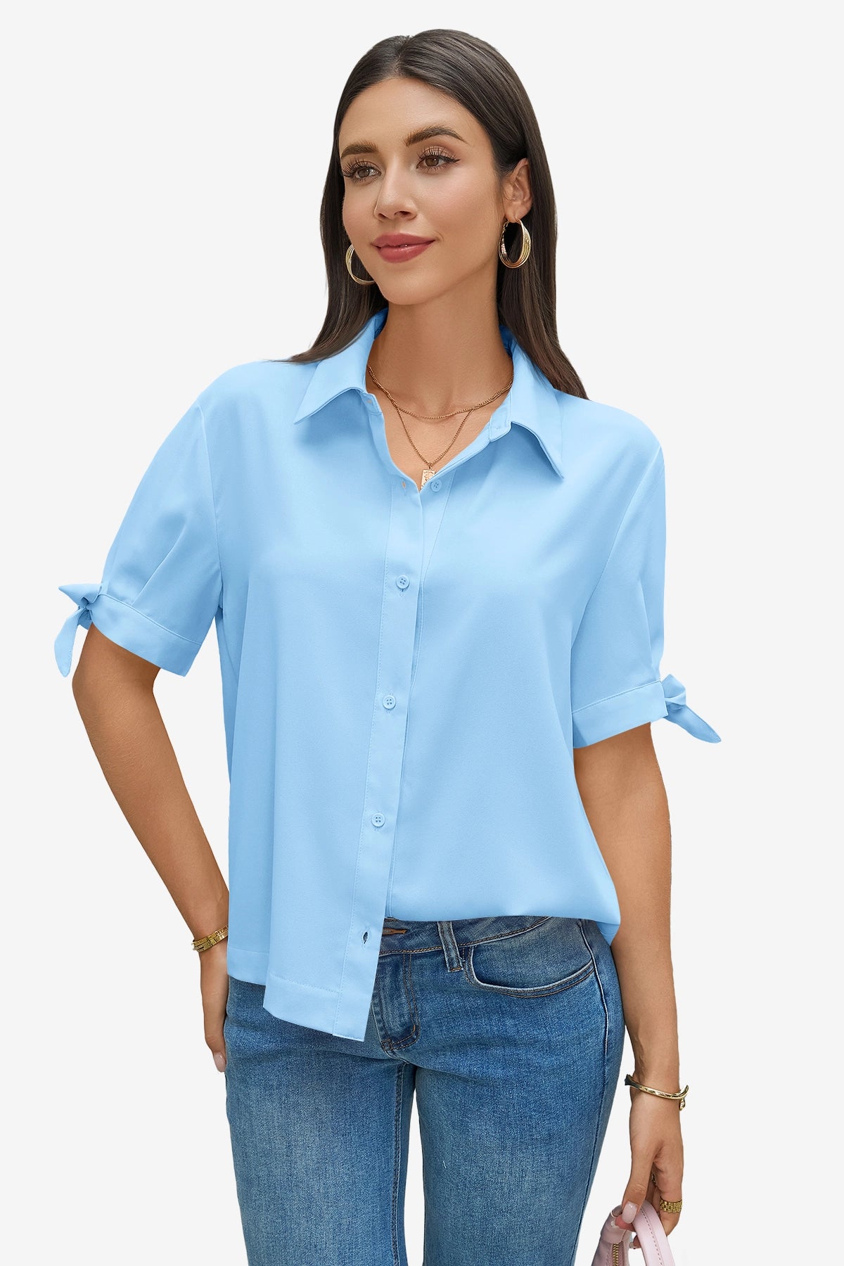 Make a chic impression with the CicyBell Short Sleeve Button Down Shirt. Featuring a unique bow-knot tie detail on the cuffs and a modern cropped silhouette, this collared blouse balances professional elegance with a playful edge. Its lightweight, breathable fabric ensures you stay cool and confident from morning meetings to sunset happy hours.